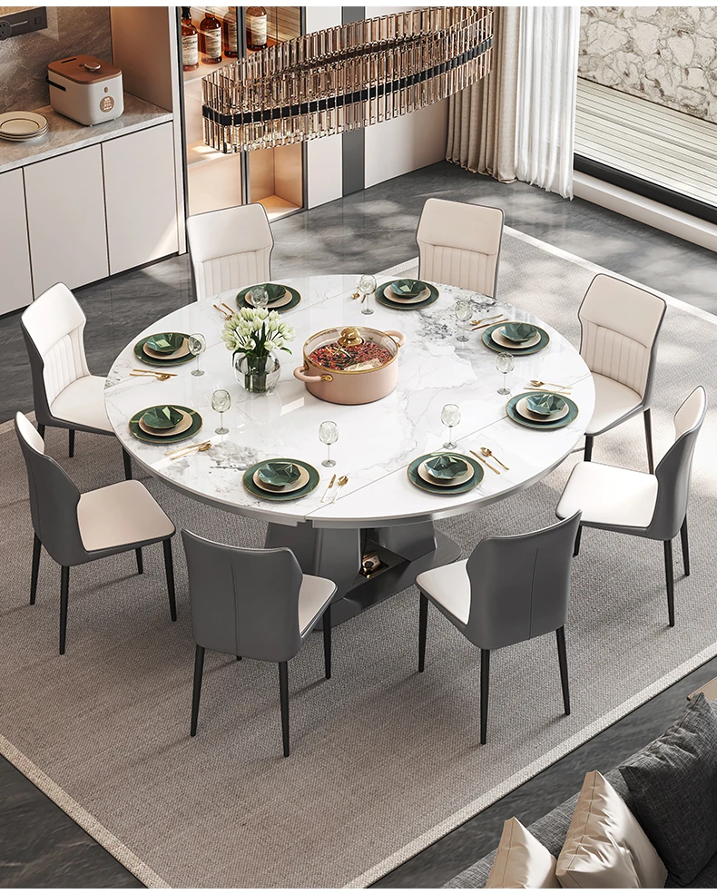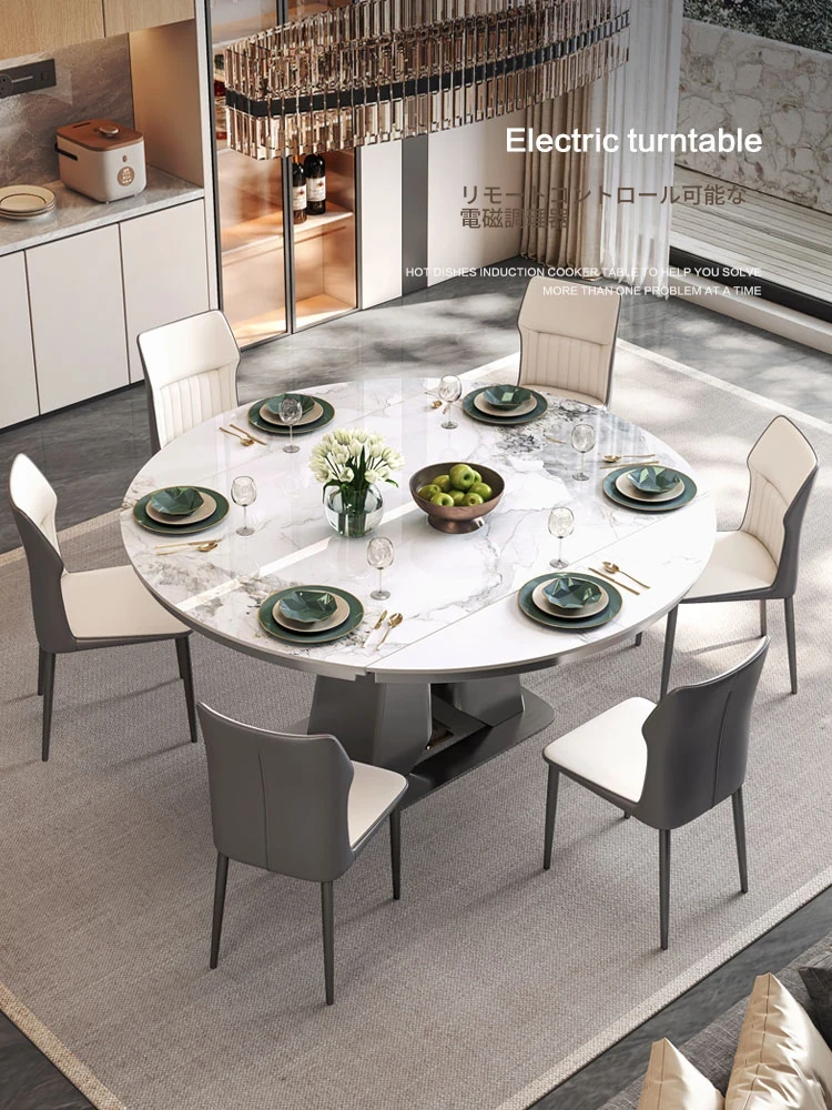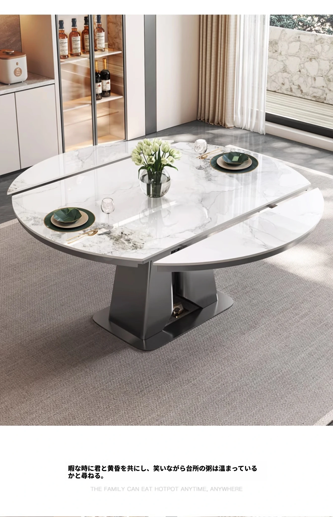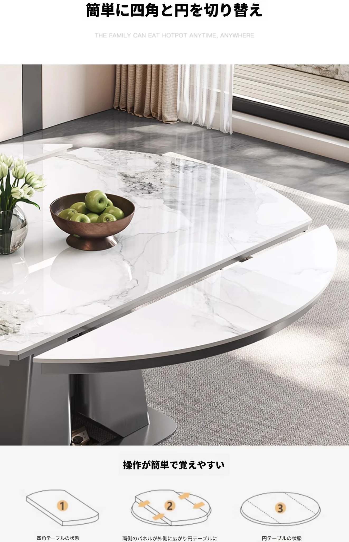 隠れた電磁炉付き!伸縮可能な多機能ラウンドテーブル - 小さな家にもぴったりな現代的でラグジュアリーな岩板ダイニングテーブル