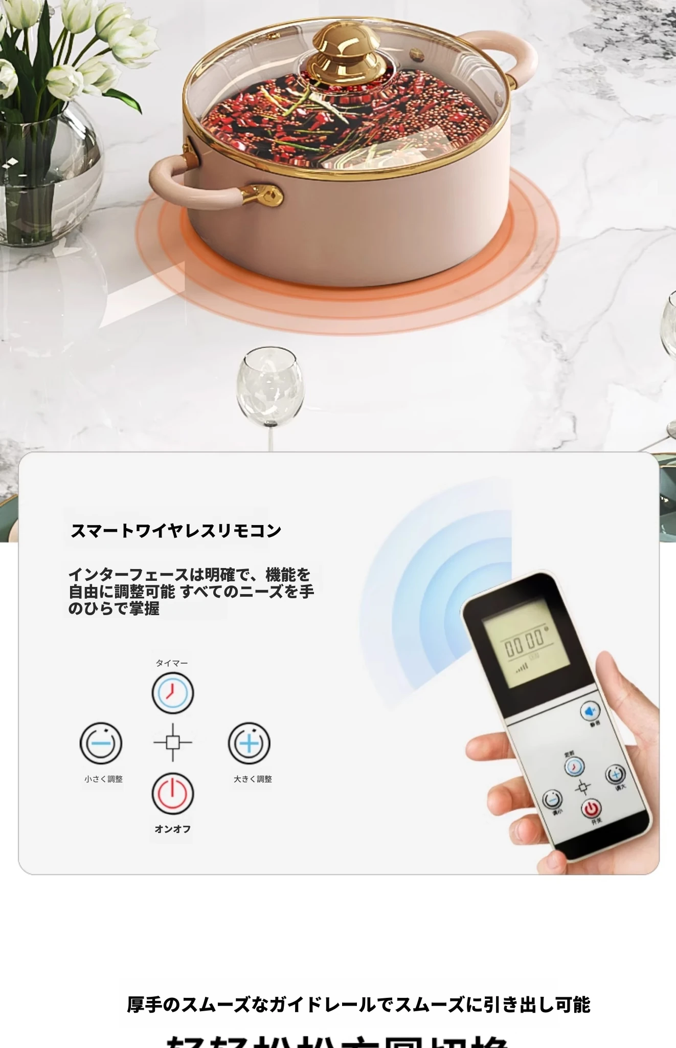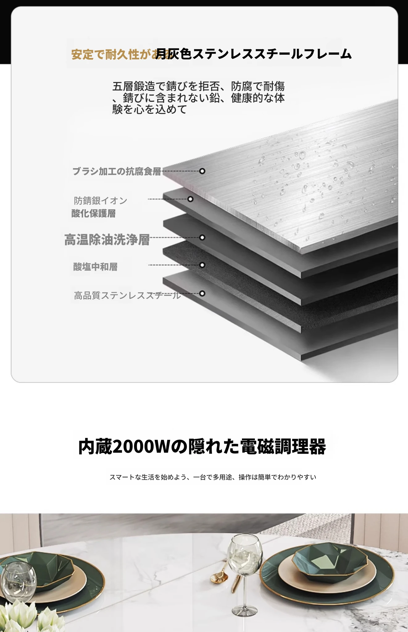 電磁調理器付き伸縮式岩板テーブル - 中古クリーム風デザインの多機能円形ダイニングテーブル、火鍋も楽しめる!家族や友人との食事に最適!