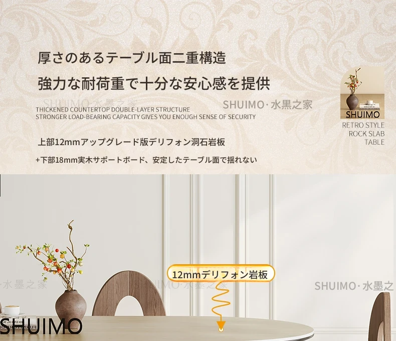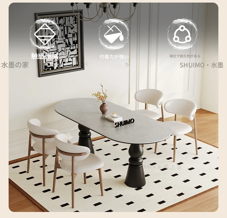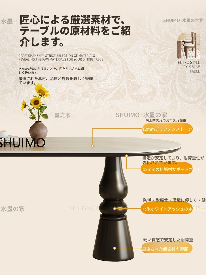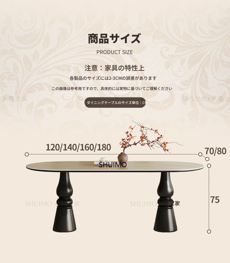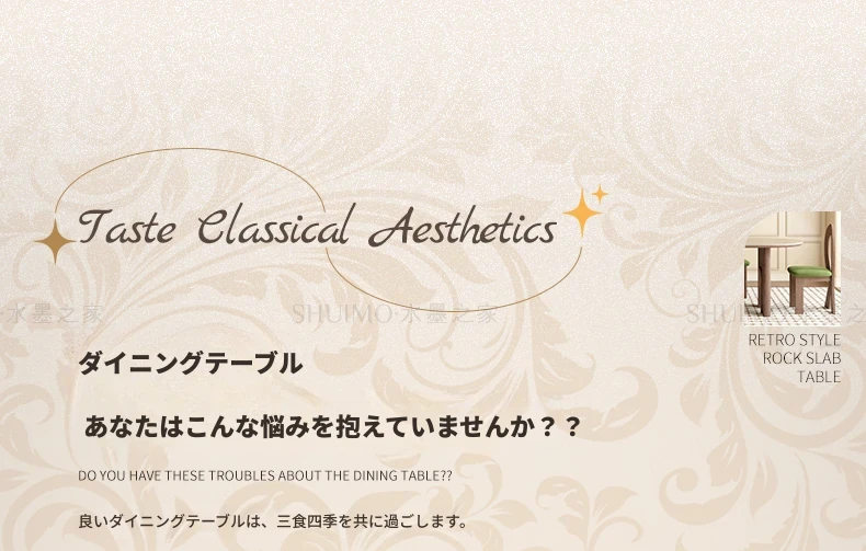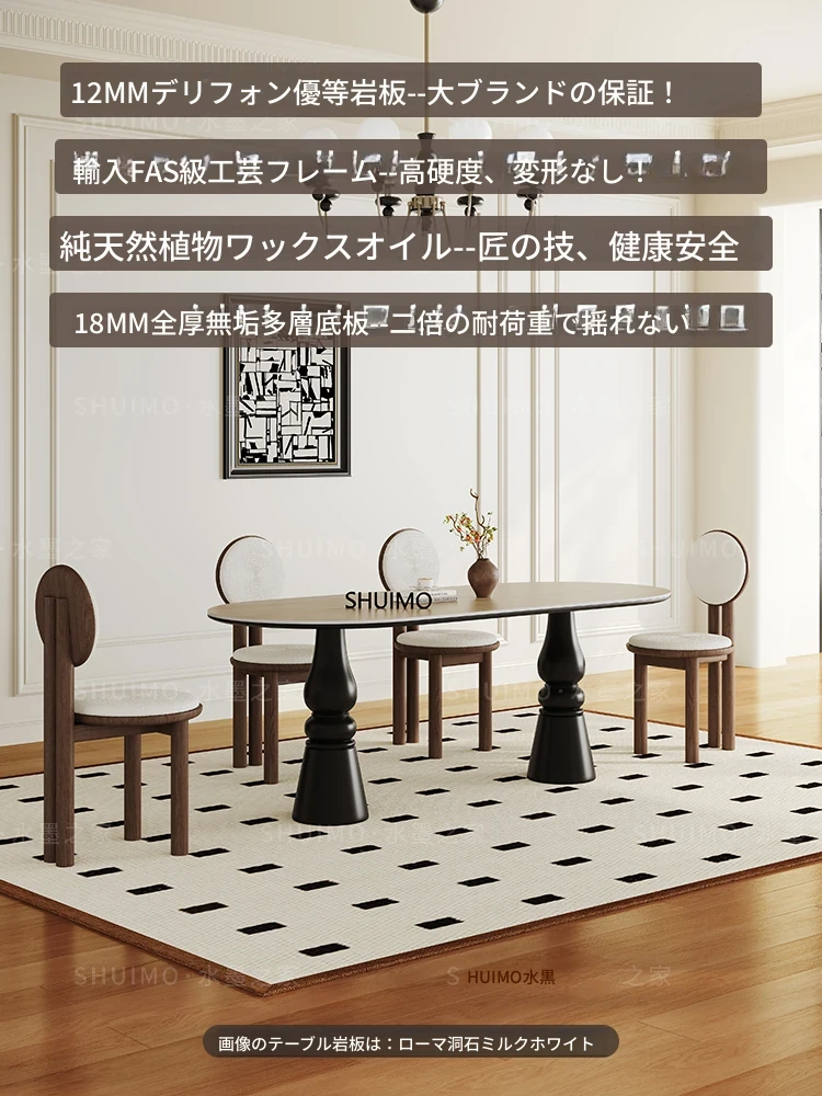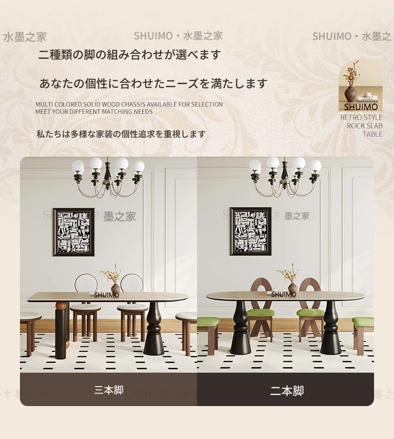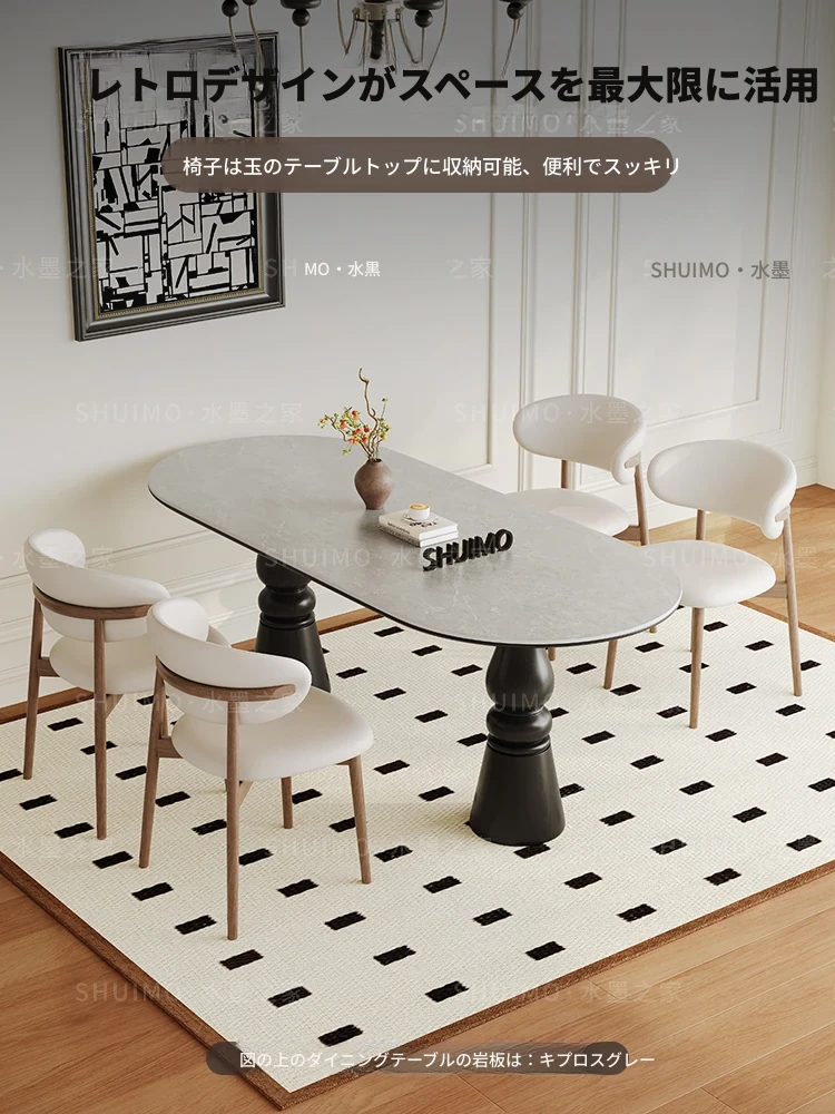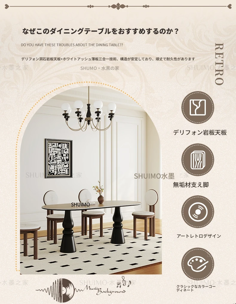 レトロな無垢材デザイン、フレンチアンティークスタイルの長方形ダイニングテーブル。高級感あふれる岩板素材使用、家族の団らんやおもてなしに最適!
