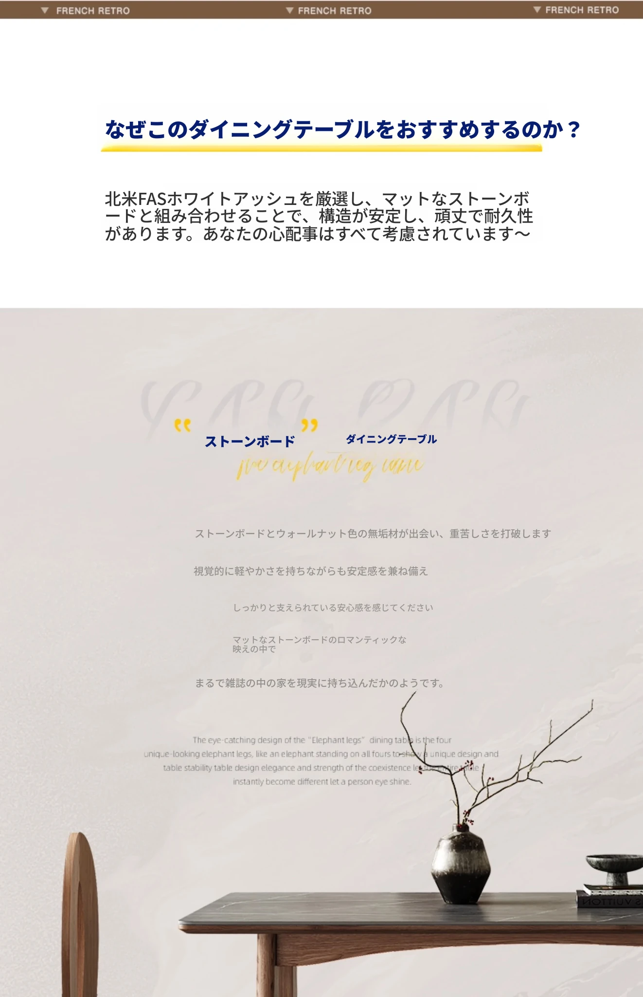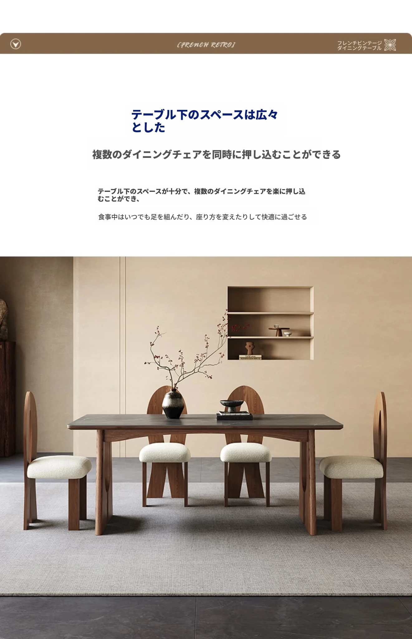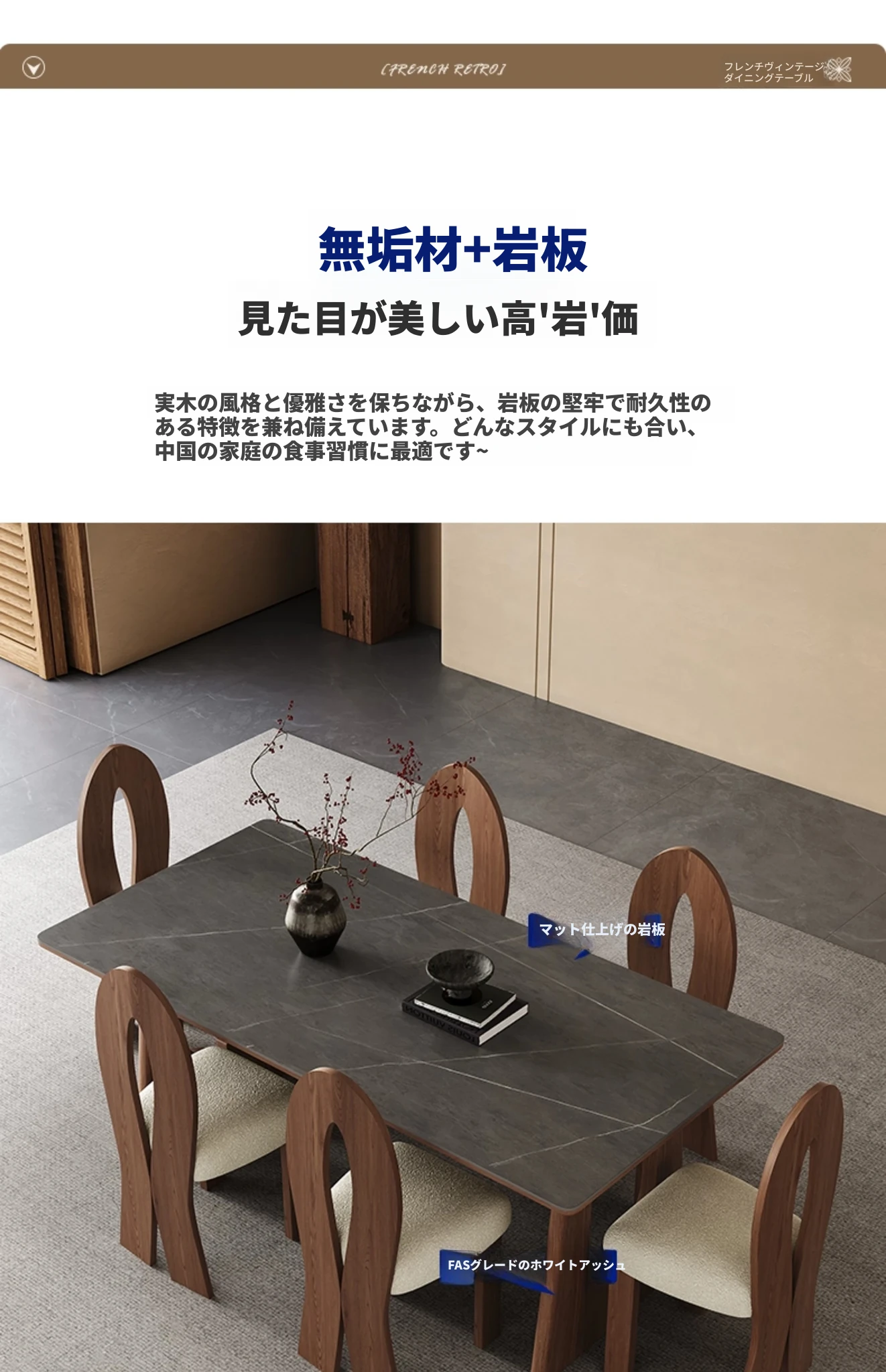レトロな無垢材を使用したデリフォンデザインの長方形フランス風ヴィンテージダイニングテーブル。高級感あふれる家庭用岩板テーブルで、インテリアに華やかさをプラスします。