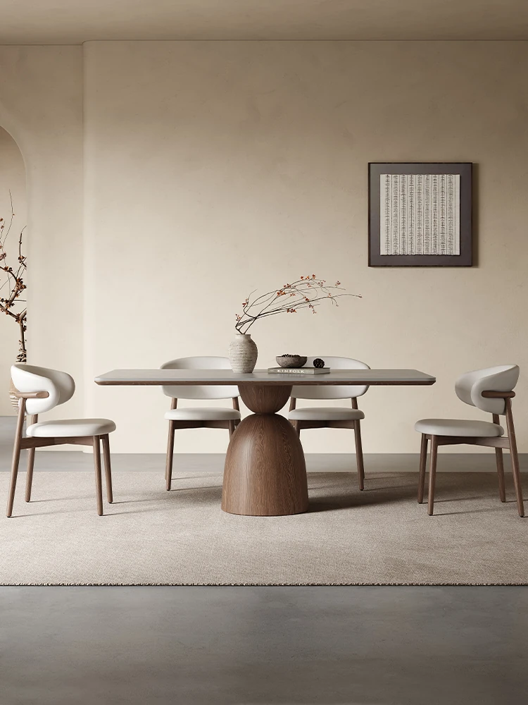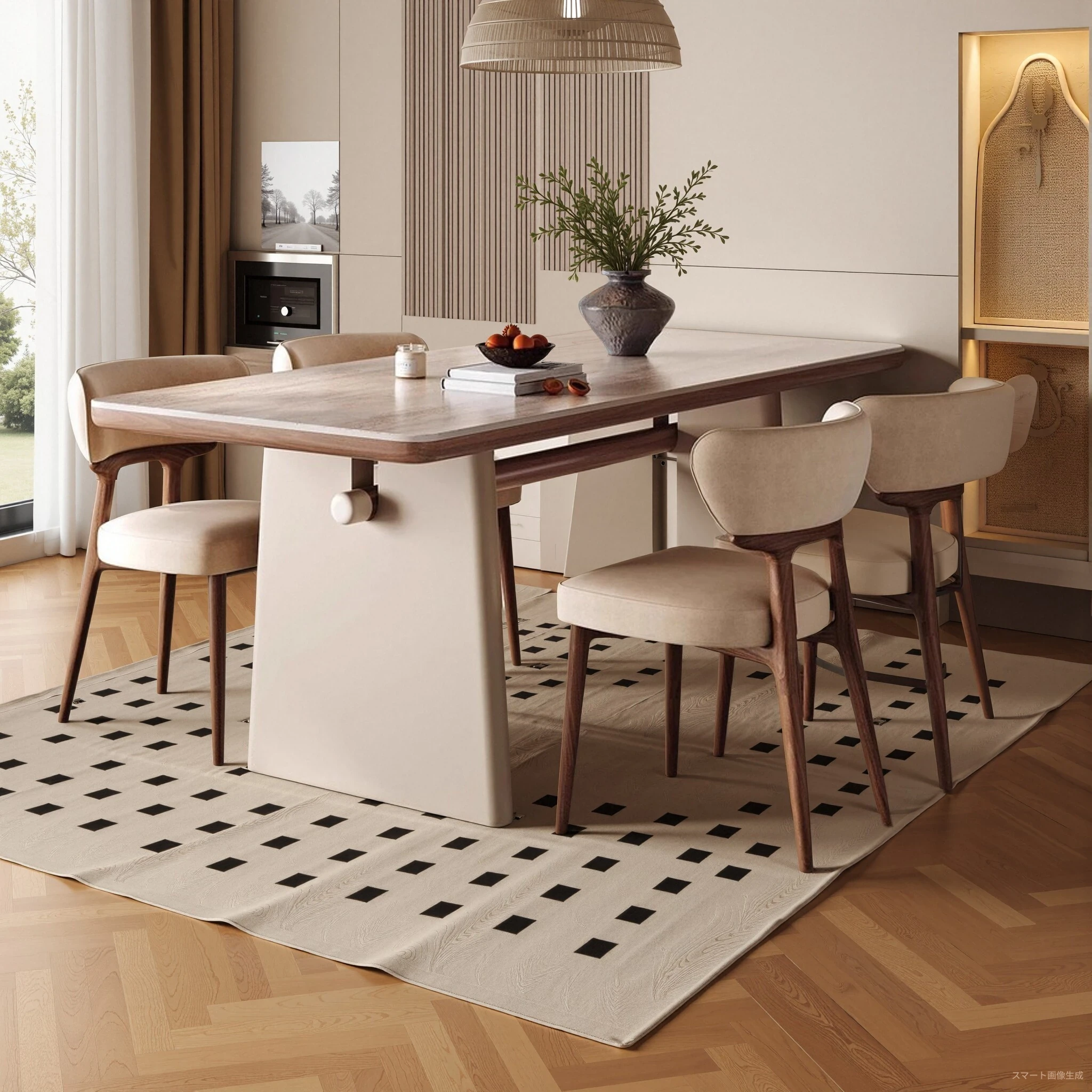 高級北欧スタイルの無垢材と石板のダイニングテーブル&チェアセット - モダンでシンプルな侘寂風、小型住宅に最適なマット仕上げの家庭用食卓