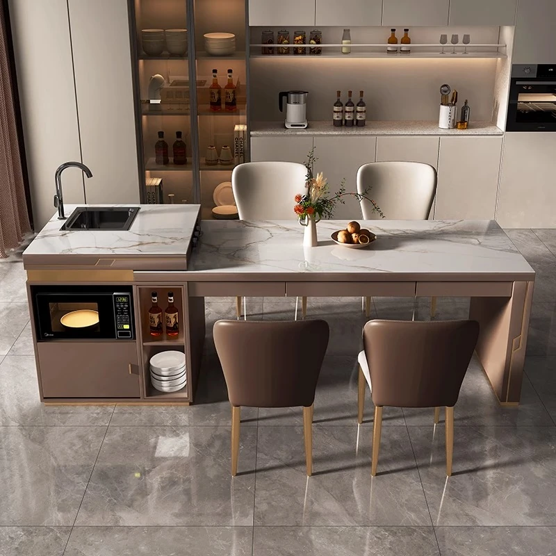 水槽付きアイランドテーブル一体型!モダンで軽やかなデザインの伸縮式マイクロ波オーブン対応キッチン用多機能ダイニングテーブル&チェアセット。家族や友人との楽しい食事時間を演出します!