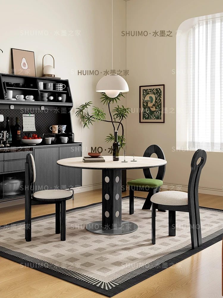 フレンチクリームのレトロスタイル!本格的な無垢材のデリフォン岩板使用、家庭にぴったりの黒い円形ダイニングテーブル。ウォールナット色の渦巻きデザインの椅子付きで、優雅な食卓を演出します!