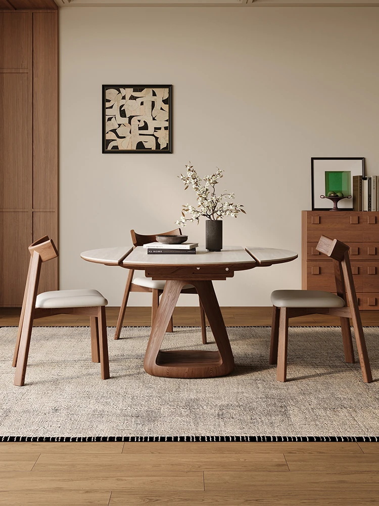 侘寂風の実木岩板伸縮式ダイニングテーブル - モダンでシンプルなウォールナット色、多機能折りたたみテーブル、四角と円形の両方に対応!おしゃれで使い勝手抜群の一品です。