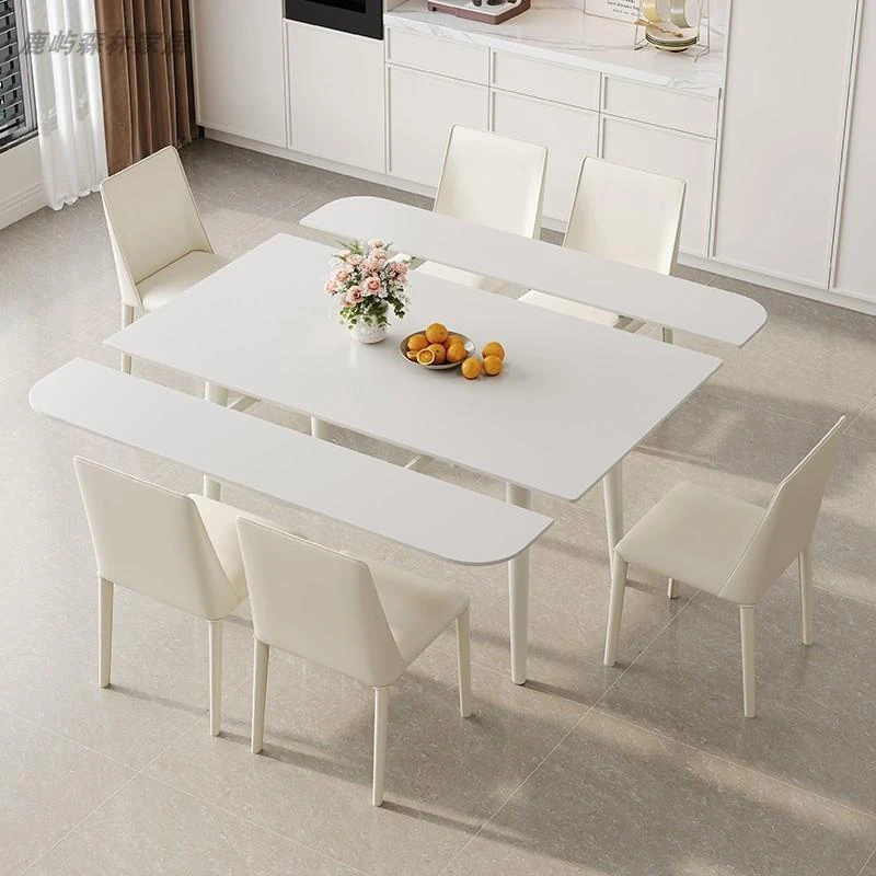クリーム風の無垢材ロックボードダイニングテーブル&チェアセット - 北欧モダンなミニマリストデザイン、小型住宅にもぴったりな長方形ダイニングテーブル!おしゃれで機能的、家族や友人との食事をもっと特別に!