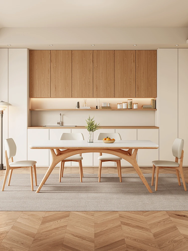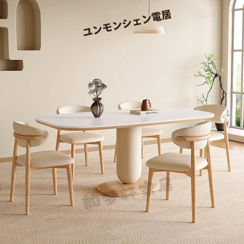 北欧スタイルの無垢材ロックテーブル、モダンでシンプルなクリーム色の長方形ダイニングテーブル&チェアセット、小さなお部屋にもぴったり!軽やかな高級感で食卓を華やかに演出します。